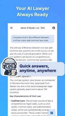 AI Reads Law: Правен Асистент е вашият AI чатбот и асистент за правни проучвания. Получавайте незабавни отговори на въпроси за закони и съдебна практика. Превърнете всеки правен текст в аудиокнига с функцията текст към говор. Вашият 24/7 асистент за преодоляване на правните сложности.