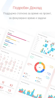 Организирайте своя дигитален работен плот с лекота, създавайки проекти и подзадачи, задавайки цветово кодирани приоритети и добавяйки подробни бележки. Никога повече не пропускайте важен срок благодарение на гъвкавите напомняния, които могат да бъдат настроени за повтарящи се задачи, помагайки ви да изградите трайни навици. В основата на Focus To-Do е адаптивният таймер Помодоро, който ви напътства през фокусирани работни сесии и кратки почивки, позволявайки ви да персонализирате времената и да получавате известия за оптимален ритъм. Така проследявате времето, прекарано във всяка дейност, и виждате напредъка си в реално време.