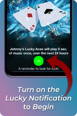 Всеки ден Johnny's Lucky Aces ще ви известява с отличителна мелодия, която трае само пет секунди – съвършеният сигнал, който да ви извади от рутината и да ви накара да се огледате за нови възможности. Това не е просто напомняне; това е покана да променяте мисленето си, да предприемате нови предизвикателства и да поемате премерени рискове. Известяването идва на случаен принцип в рамките на 24 часа, гарантирайки, че посланието на Johnny Aces да търсите късмета и да действате позитивно, достига до вас в неочакван, но винаги подходящ момент.